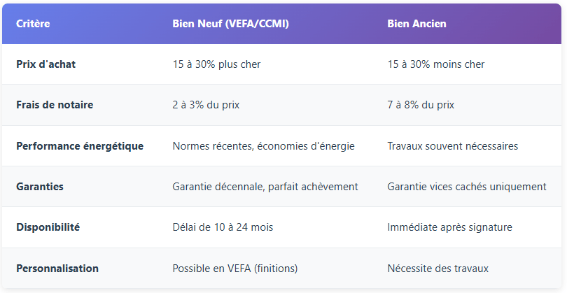 Mon conseil : Le neuf coûte plus cher à l'achat mais offre des frais de notaire réduits et des économies d'énergie. L'ancien est moins cher mais peut nécessiter des travaux. Calculez le coût total sur 5-10 ans pour faire le bon choix !