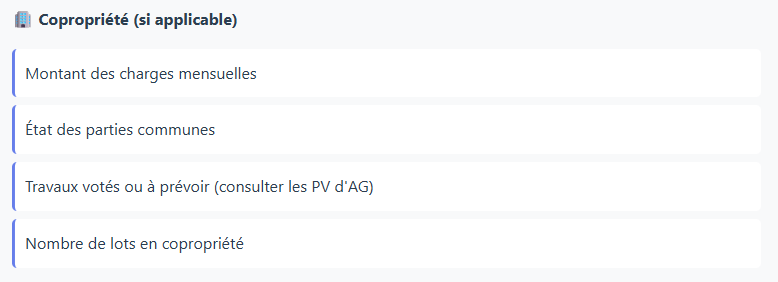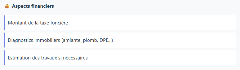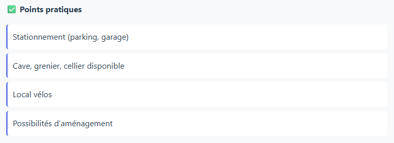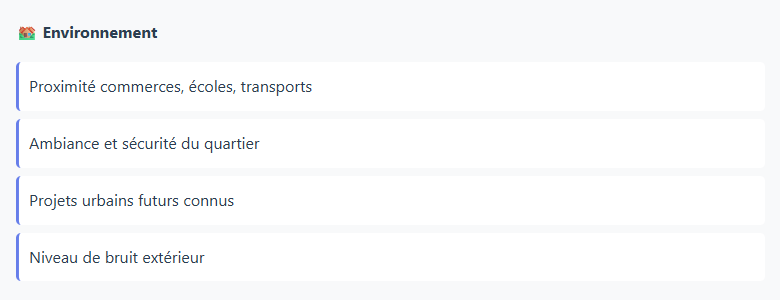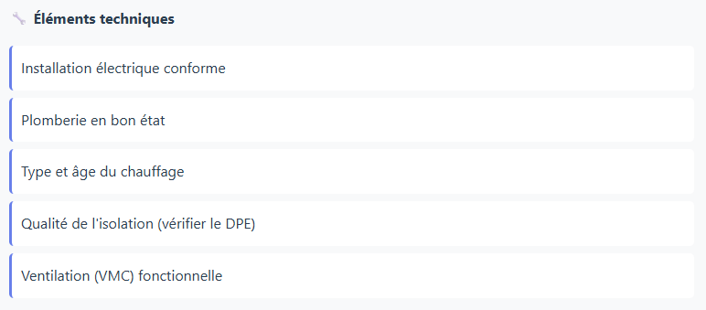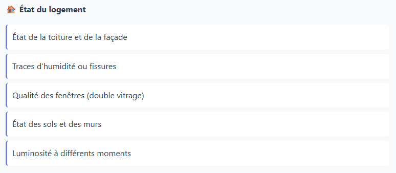 Pour éviter les coups de cœur irrationnels et comparer objectivement les biens, utilisez cette checklist lors de chaque visite :